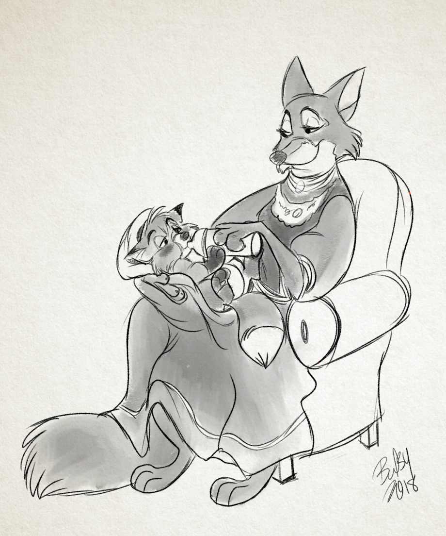 Maid Marian (from “Robin Hood”), who works as a nurse at the city hospital, is tasked by the orphanage/nursery ward to take care of a baby Tod (from “The Fox and the Hound”), who is touched with a small noncontagious fever. After failing to find a blanket to wrap him up in, Marian suddenly looks down at the poofy new skirt of her dress and decides that it would make a good substitute. And so it did! And of course, as pictured above, Tod is being fed a warm bottle of milk by his newfound foster mother, and bundled up safely in her ‘sick day blanket’, hence the title of this commission.