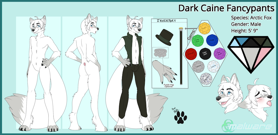 Name: Dark Caine Fancypants Species: Arctic Fox (most of the time) Gender: Male (usually) Occupation: Entertainer (dancer, singer, magician) Hobby-occupation: Adventuring in search of answers about the origins of his cane