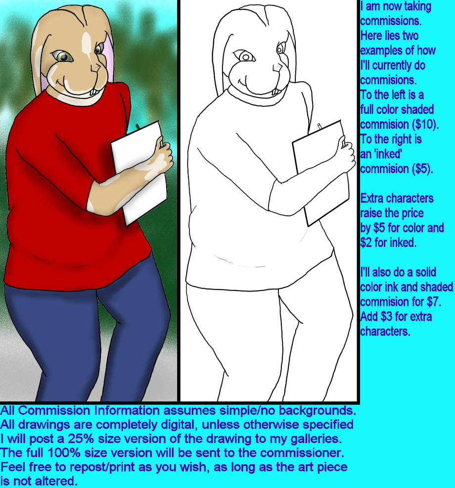 So I've finally decided to go ahead and try my paw at taking commissions. I'm new at this, etc. And honestly I havn't had anyone ask me about commission information yet, but I figured I'd be better off setting out some rules. I will note that I will not be drawing mature rated items, if I can't hit 'general' for the submission I don't want to draw it. So no bits, no sex, no yiffing, etc. This is more of a personal choice than anything else.