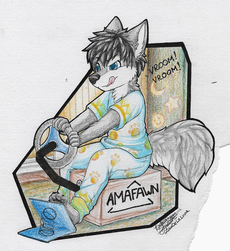 So after a convo with my friend Thunder the wusky, he mentioned how cute it would be of his sona racing a fake wheel like a game since he started...cross..something. And since I was bored when I went to check out my back, I doodled this...I liked it so much IHad to finish it.