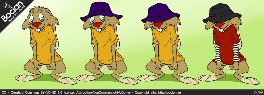 Based on a more 80's/90's look with a bit of a hippy look tho he's not one. Also as I loved Disney's old cartoons I designed him quite similar at first then changed the style and started forging my own inspired by various artists, but I kept the idea of "shirt only" toon characters. Shame that actually he was created in 5 min but I felt a strong bond with the character as I had a pet bunny myself. The hat was inspired only by My Real black bucket hat which I have for over 11 years now x).
