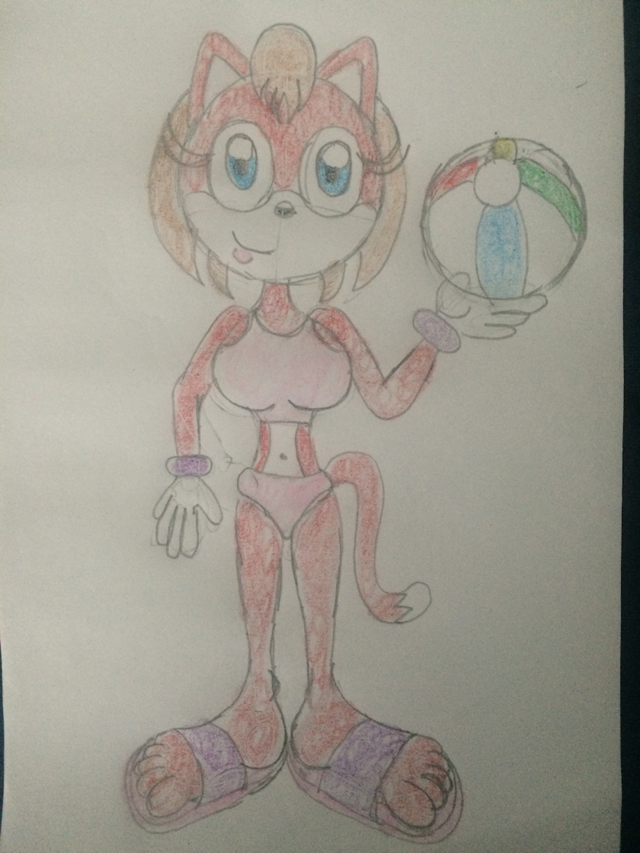 Decided to draw Stephanie the Cat wearing a pink two-piece bikini along with pink and purple sandals. In addition, I drew her holding a beach ball.