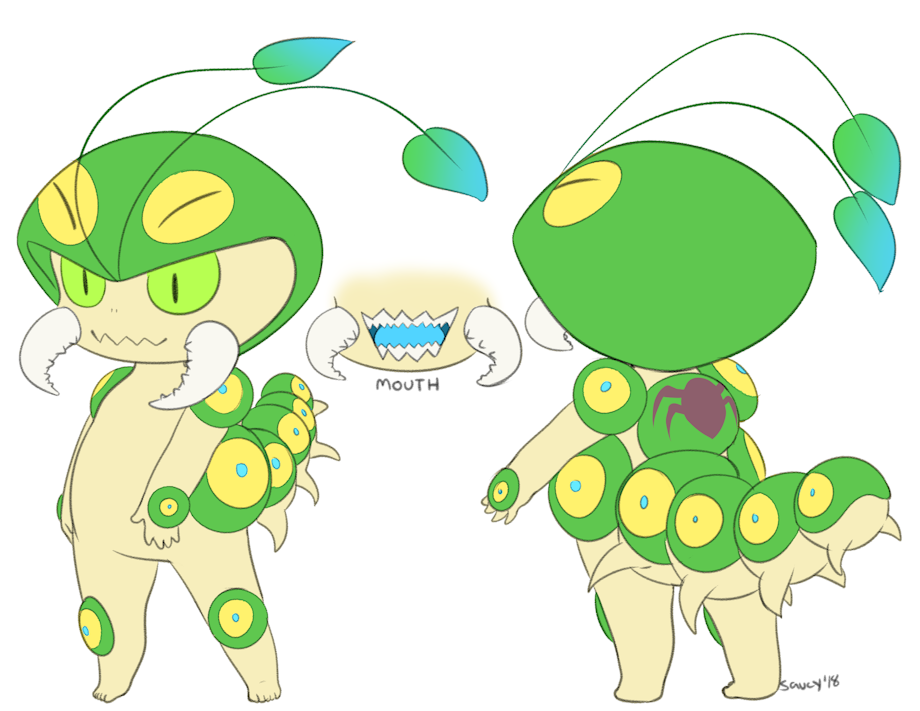 slim and small body, armor covers her back, tail, head, knees, shoulders and backs of her hands, mandibles by her mouth, razor sharp teeth inside her mouth, spider mark on her back armor, her eyes behave more insect like and don't blink, she also has long antenna. the outter circles are yellow, inner circles is cyan / blue.