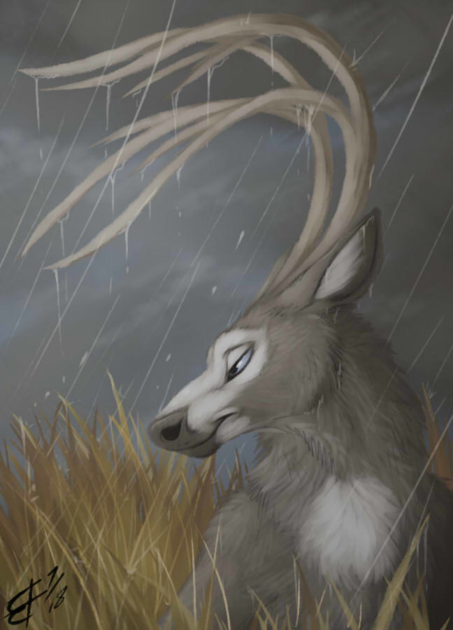 Antlers in the rain, stormy yet peaceful and content, nice piece!