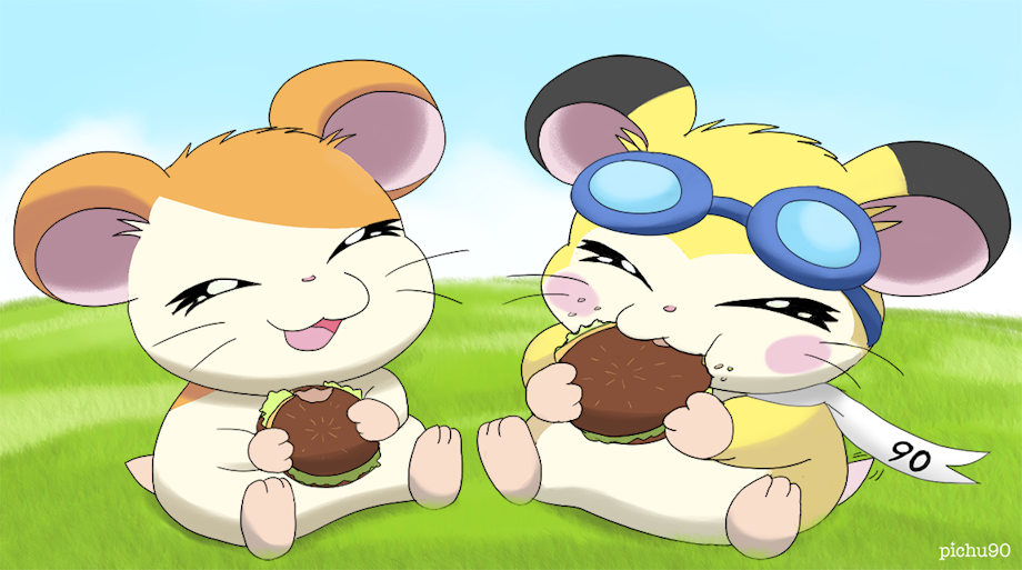 My main OC as a hamster, having a sunflower burger next to the fun loving ham himself!