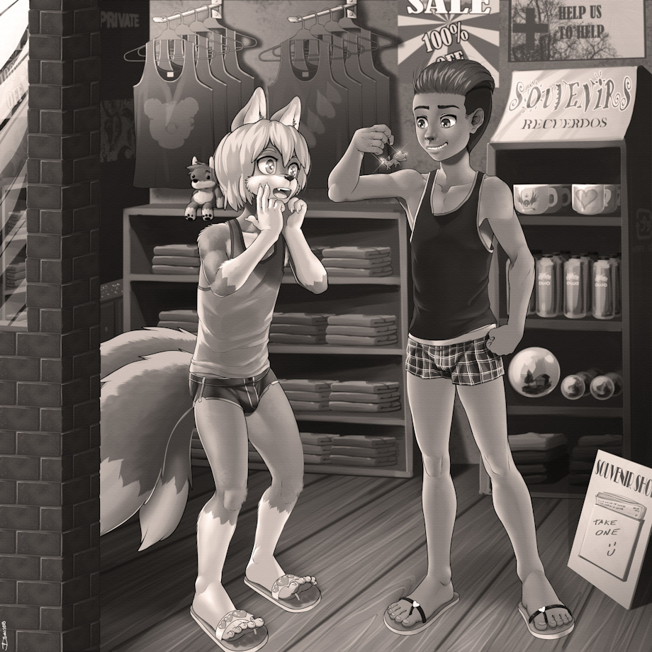 Antony smiles as he entered the store, its pretty neat place that sells silly stuff. Shirts, plushes, nickknacks, and charms. Kichi followed him in, his ears twitches as he looks over the charms display before turning to Antony, who was busy cheaking out that kitsune tush.