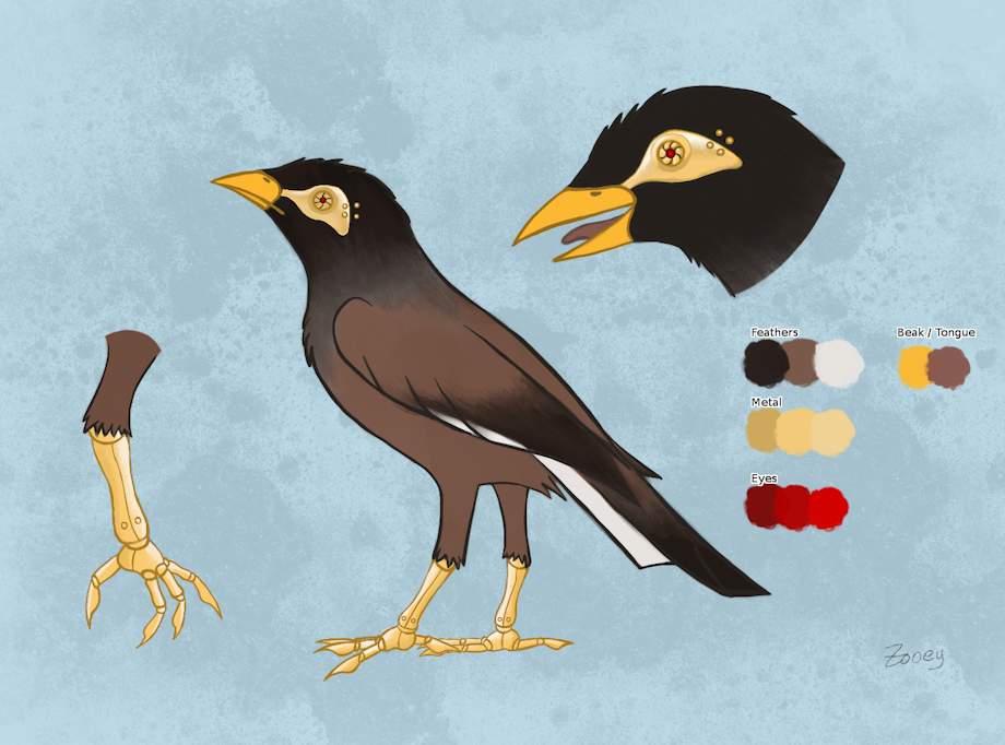 And since Hallo is my little helper, it makes sense that he's a myna bird, and I wanted to give him a robotic form, even if it's mostly hidden under his feathers.