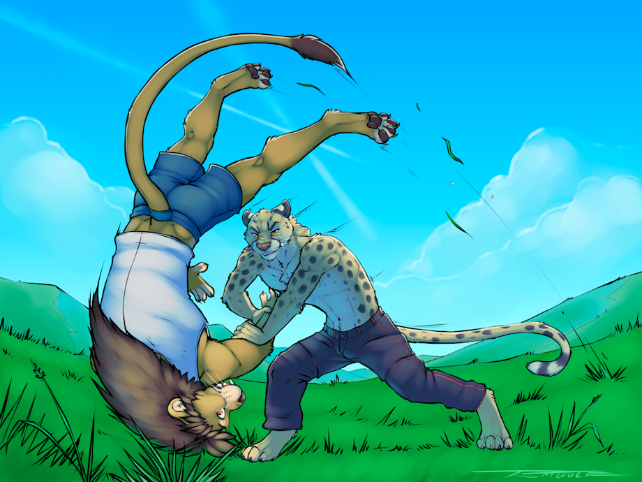 awesome! this grapple looks like it would be LOTS of fun! hope the lion isn't too sore afterwards.... but im sure the cheetah is in for it now! would love to be the lion's tag team partner!