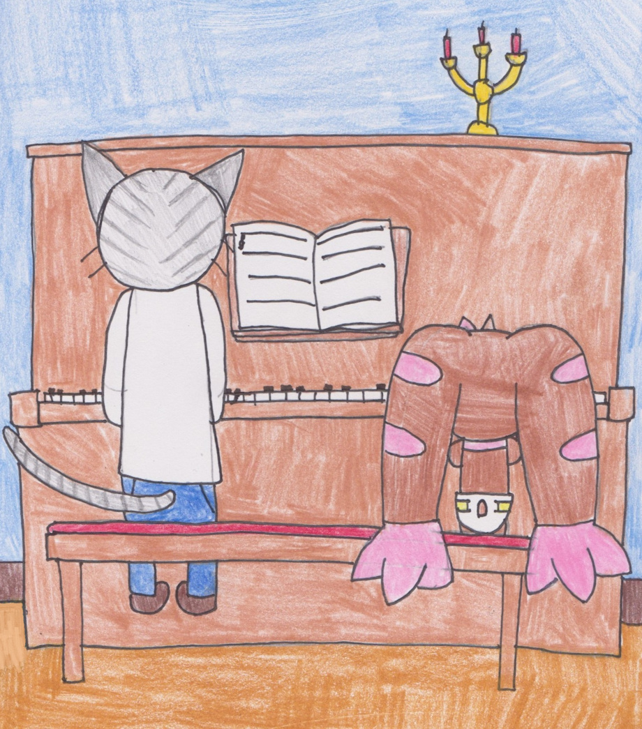 Fred teaching Hazel how to play the piano. And she's actually getting the hang it pretty well.