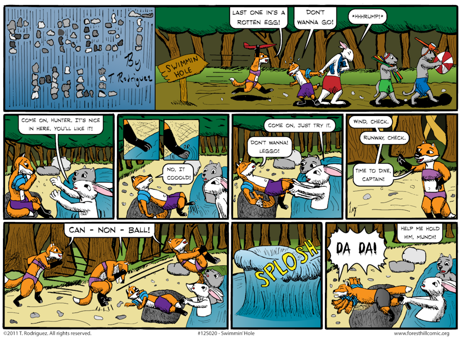 Yes, I know that seems like a repeat from what happened in the main comics, but keep in mind that I drew this shortly after Colin asked Flora for the information about a preschool, and that the Sunday comics were never really meant to be part of the main storyline. It just so happened that I covered Hunter's first couple days later on as the story progressed in that direction.