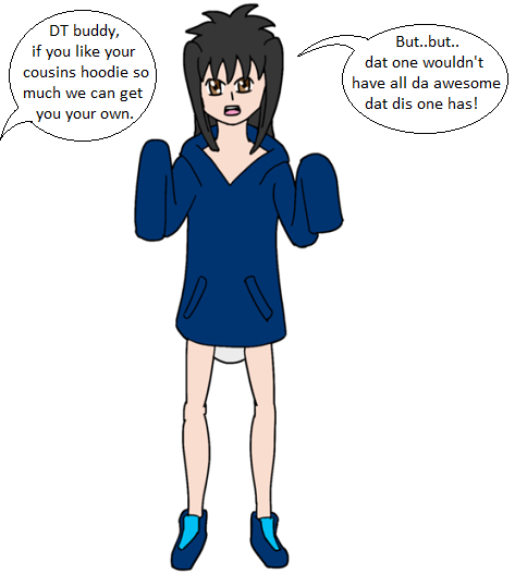 Widdle DT just loves his bigger cousin and hence stealing his cousins hoodie all the time. and it's not even the style of the hoodie that he wants it for, he wants it CUZ the super cool big boy wore it. ^^