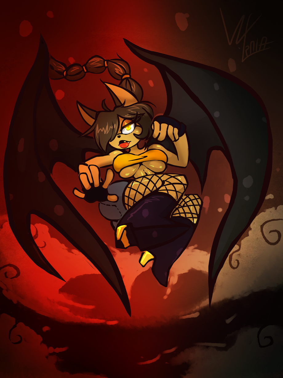 When I was but a young lion living in the hot plains of my home, I was influenced by the sight of nature's fiercest methods of destruction to such a point where I wondered what it would be like to see such power up close. Of course that was before I obtained my "gift," one that I do not regret trading for my ability to bare children. When I met Whisper for the first time she was a child, a dancer for a village nestled into a forest at the edge of the humid pits of Asia. Her long, pointed ears reminded me of devil horns, and her abnormally large wings gave me the first idea as to what I could use her for. Looking at her now, I feel pride. The ragged young bat I had met had been raised into a luxurious, fierce combatant. I admit training her and watching her grow was somewhat difficult, at times I was sure she would be a better fit for an escort, but once she began to find the power of those wings even I was at a loss for words. To put it simply every beat of her massive wings threaten to crack the ground beneath her, shatter what stands in her way - or is, god forgive, beneath her. She can summon gusts of glorious destructive winds at a whim, twist and spin to disrupt those around her, and toss even heavy fighters in a fit of wind. The power is incredible, the potential is endless, her strategy is almost flawless. It's too bad she's such a tart. As she grew her body filled out to the point where even I have given rather shameful glances at that buxom shapely girl that I raised like a daughter. She revels in the attention she gets, and although she cannot take a hit to save her life she seems to enjoy every punishment given for a wrong swing, a bad kick or miss. Still, I cannot deny that although she's growing slower than my other subordinates her potential as my heir far exceeds that of her colleagues. Now I must excuse myself. - Lord Braham II