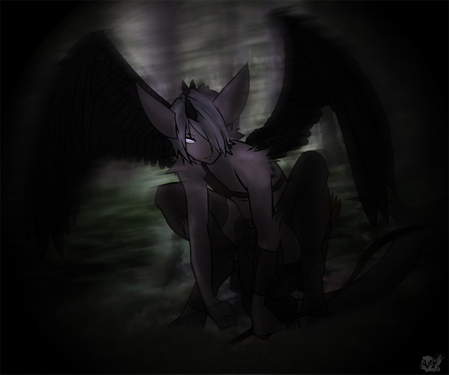 His tribe are proud hunters and as part of their culture they test their young for accuracy with a bow as well as skills trapping and tracking. Isu was less than satisfactory to their standards and was removed from the tribe. As a result, he has lived a solitary life in the surrounding forests of his people, hunting prey while avoiding the other hunters. His horns and wings were died black by his tribe to forever mark him as one of the 'forgotten people', referring to how their hunting gods forgot to bless him with all the traits necessary to be a hunter.