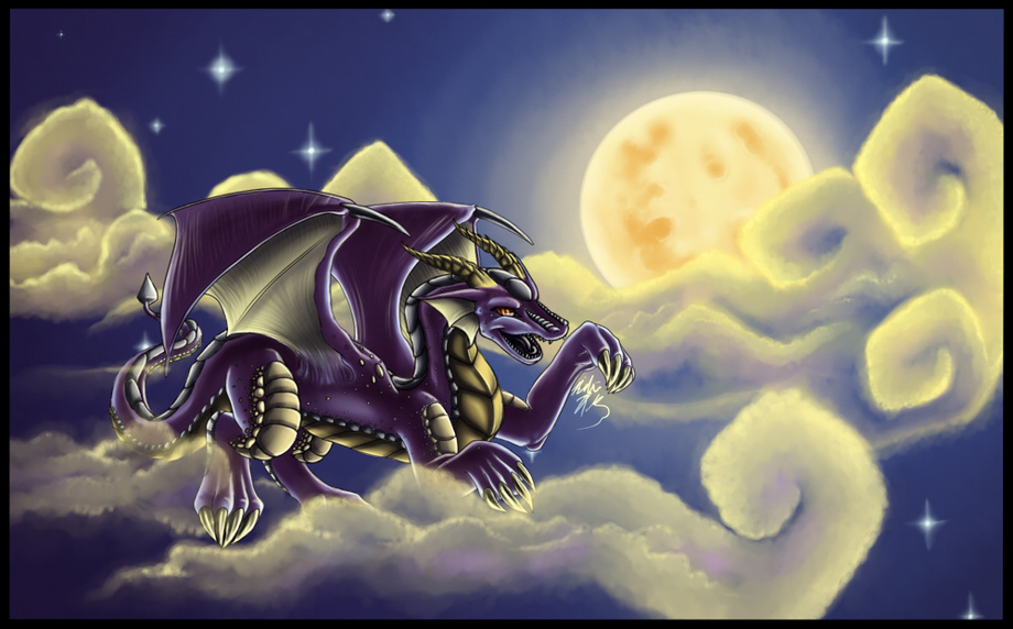 Here's the results: a cute lil' purpley dragon flying though some clouds in the moonlight.