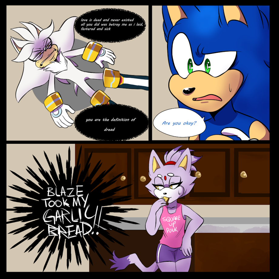 Sonic: Oh come on Silver it's just a garlic bread. Silver: Would you say the same thing if Amy eats your last chilidog? Sonic: Uhhh... I see you're point now.