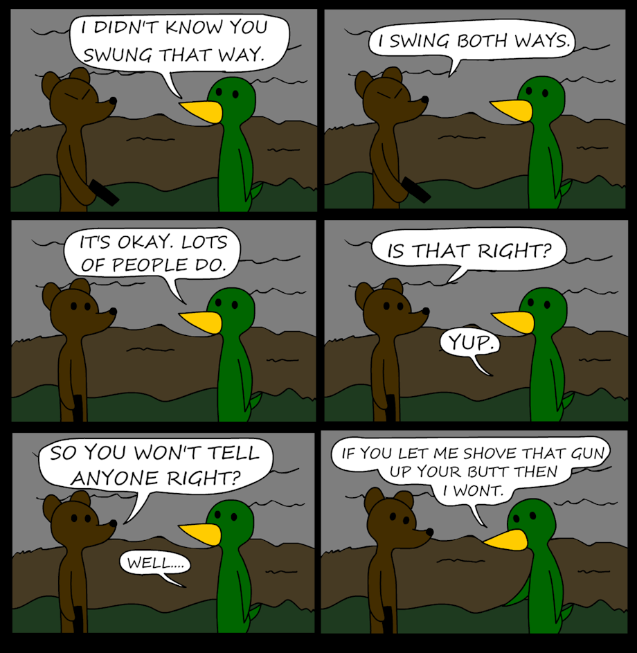Haha with "swing both ways," the bear should have given him a left and right hook. Swinging his arms