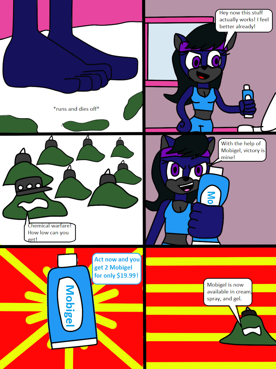 It's a 3-page comic of a Mobigel ad featuring my gal Nancy the Panther. Here, a bunch of fungi cause athlete's foot on her feet until she gets her hands on Mobigel anti-fungal gel.