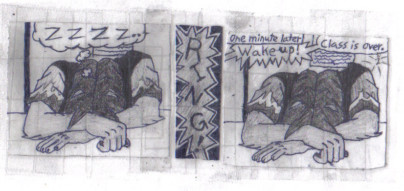 one of my first attempt at making a comic strip. just so you know, each panel was a doodle on different sheets of paper and were cut and taped together to make this.