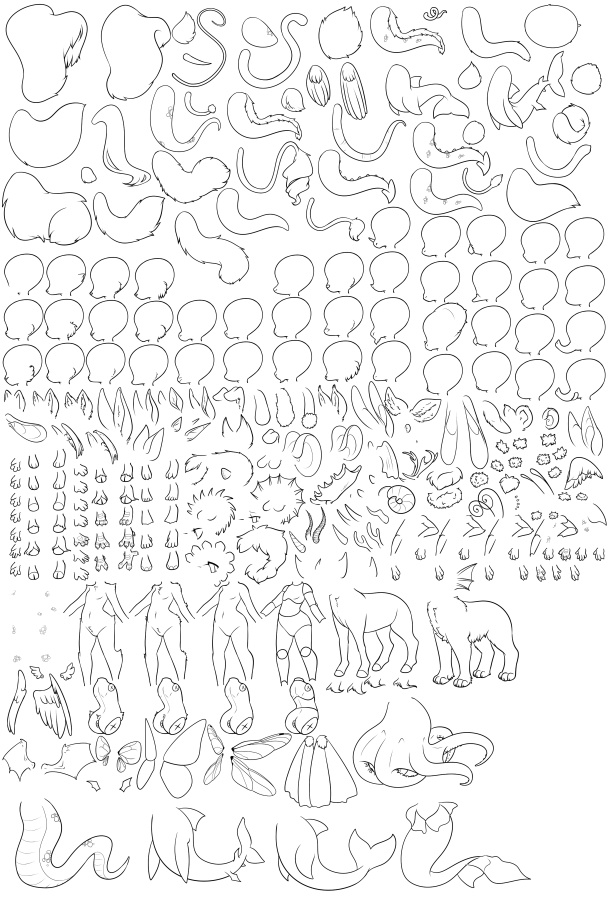 makes me want one that goes with 4-directional 3-frame RPG maker sprite sets. Would sure make NPCs easy. ^not a suggestion or a request, just coffeebrain compelling me to do stupid things. An actual thought though is legless/armless base body frontfacing, or stump arm/leg variants, for amputee characters, and characters that just don't have arms or legs or both because wings, magic, ect. Also, I think I might make a character like that. Psychic quad would be interesting.
