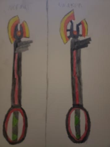 a weapon forged with ancient tech and no one was able to use and weighs about 50 tons but when chooses a worthy wielder it's light weight, a fire elemental weapon and can cut through some things with a smooth clean burning cut such as metal, steel, wood, stone. the thrusters on it can make a swing faster and stronger, but in awakened mode it multiplies the users strength, durability, defense by 5 times but drains a bunch of energy of the user.