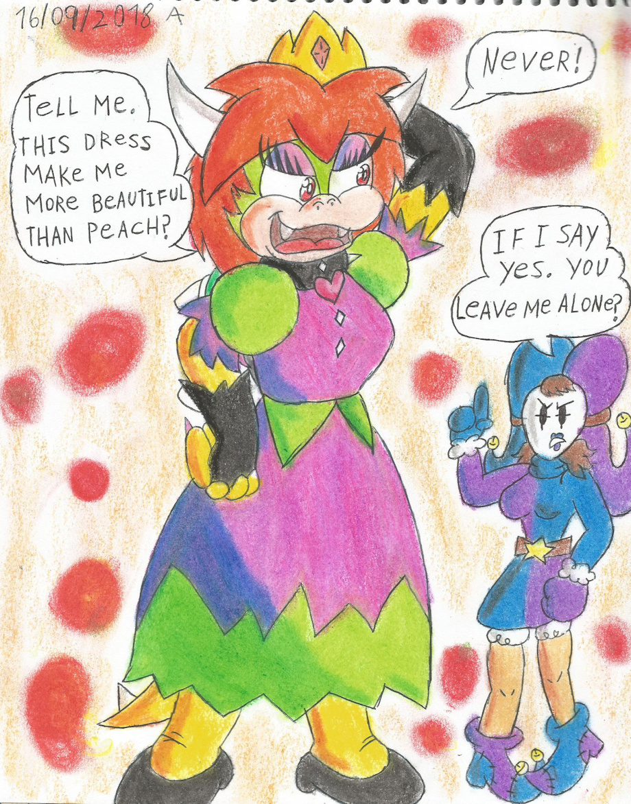 El retorno de la malvada Reina Dolores O.Koopa. Esta vez, estrenando su nuevo vestido. (Es verde con morado porque desde que descubri la verdad detras de "Daily Dosel" que no paro de ver por todas partes esos dos colores juntos)