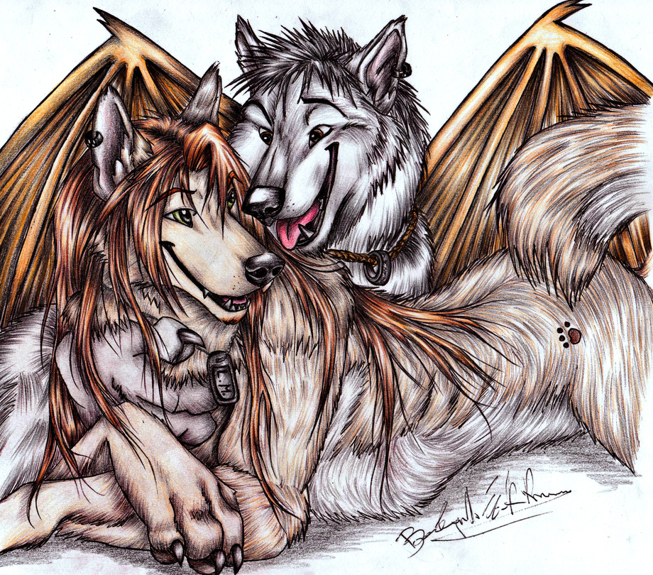Ecco la versione finita del disegno per il mio amore Lupo Bianco per il nostro primo mese insieme..X3 ♥ Come ho già detto prima, la base del disegno da cui ho tratto ispirazione è del grande artista Blotch. Colorato al solito con pastelli e penna , ho applicato anche due colori speciali l'argento e il dorato, l'argento per i ciondoli che indossiamo e il dorato per le ali e la collana del mio amore...il problema che il disegno essendo passato allo scanner non fà notare questi colori particolari >_< ...si vede solo sè visto il disegno dal vivo >.<.....peccato.