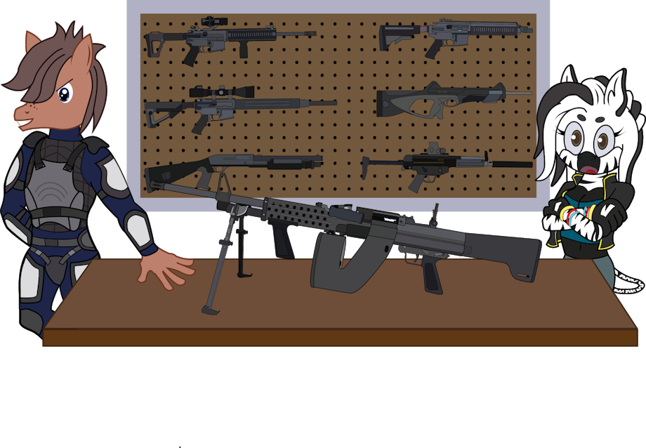 " | When you talk openly about your weapon collection, be ready to prove it. When you say you have some rare piece of experimental weaponry that never fully went into production, there is only one way to prove it.While a rational person wouldn't openly prattle on about such matters, this pony isn't the kind to stay silent about it. |