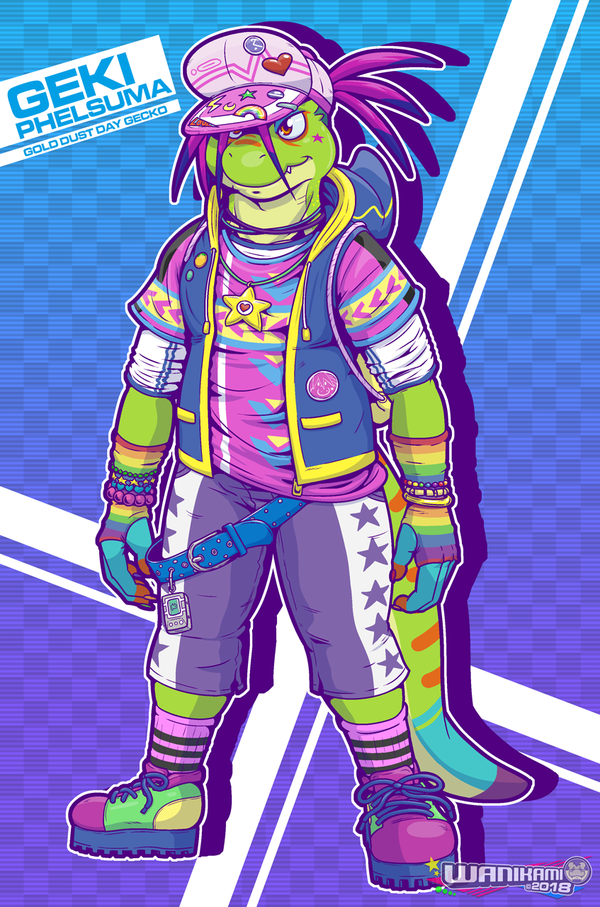 Almost 20 years ago, I created a crocodile character named Gex, who was inspired by TMNT character Mondo Gecko. In his original backstory, Gex was the younger brother of the star quarterback of a football team named Marsh, and was secretly having a relationship with his brother's teammate/best friend, Mitch, a turtle. As I've mentioned before, Mitch eventually evolved into Butch, everyone's favorite krokojock. Like Mitch, I had wanted to revive Gex for the modern era, so I renamed him "Vinny" (don't ask where the name came from; I just chose a name out of random and can't remember why that popped in my head. XD), made him a kroko, and drew a pic of him in 2011 with Kodo, the first OC I've ever created back in 1995-96. I hadn't drawn either of these lizards since 2011, nor had I really developed any backstory for them. Years later, I found myself getting obsessed with Mondo Gecko again, and I felt like having my own gecko character in the Waniverse. I decided to go back to the character that reminded me of Mondo the most, Gex/Vinny, and totally redesign him into Geki Phelsuma!