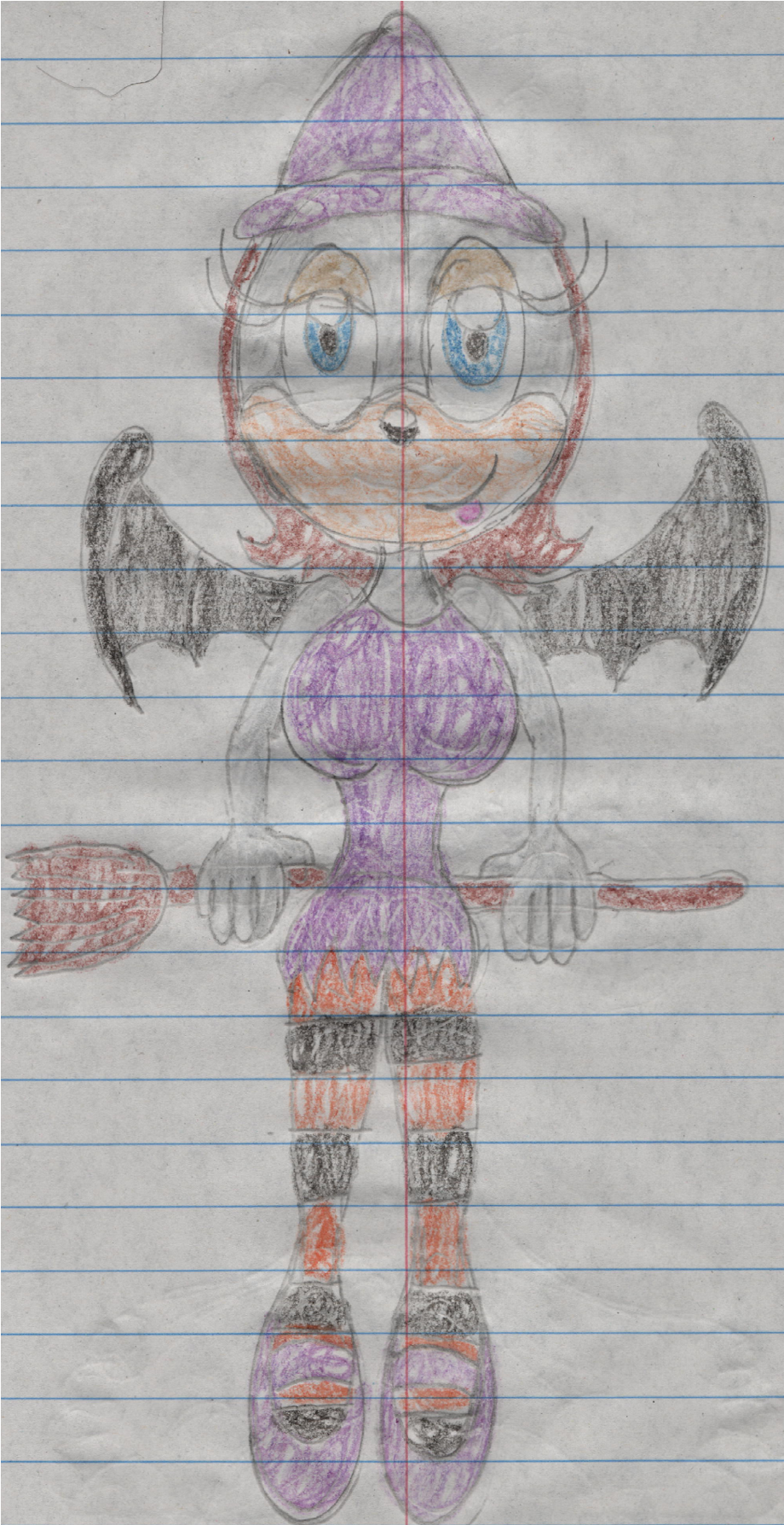 For Halloween this year, I've decided to draw Melissa the Bat dressed as a witch sitting on a floating broomstick. Her attire consists of a purple pointy hat, a purple dress, long orange and black striped socks and purple Mary Janes.