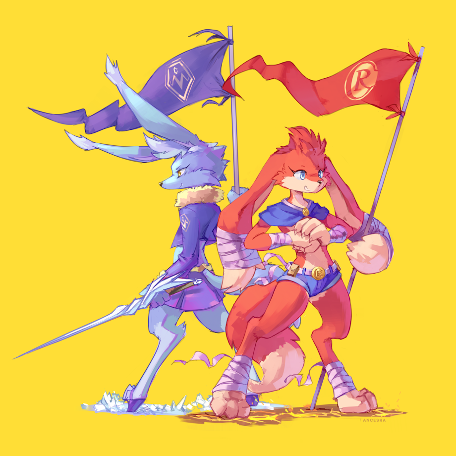 Enne Radlaide and Ildra Mavol leading their clans to battle (Commission). World and characters by
