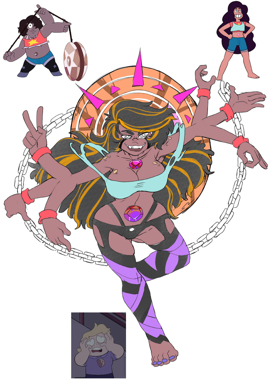 Sketch Stream Commission for Whitewhiskey of a gem fusion between Stevonie, Amythest, and Sadie.  WHAT HAS SCIENCE WROUGHT!!