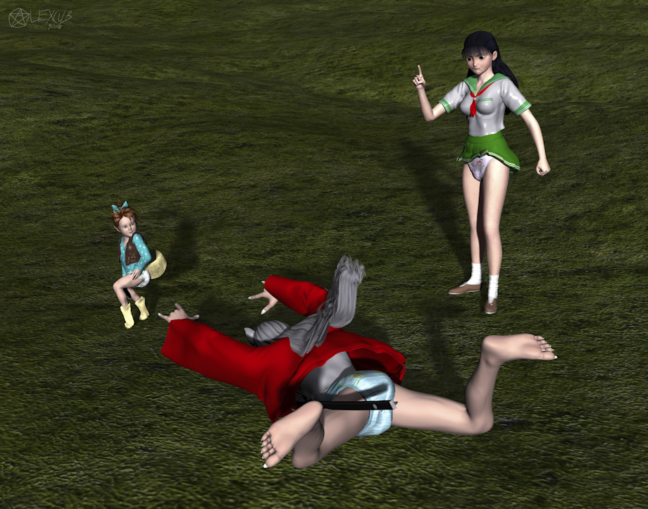 I thought I'd finish up my Inuyasha set with a classic "Sit" scenario where Shippo shakes his big diaper butt at Inuyasha. Well, he gets the predictable response from Inuyasha, and in this case, Kagome intervenes. Faceplant ensues.