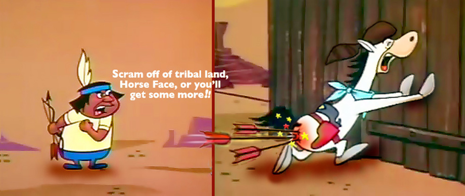 A mash-up I made a while back featuring Quick Draw McGraw and Big Chief Little Runt with frames from the H-B cartoon, Scat Scout Scat. Here, Quick Draw is not cast as a lawman, but is instead a trespassing frontier scout. (This short has proven itself quite prescient.) Funnily enough, the moment depicted is actually the turning point(s) from which the warring parties make peace. Quick Draw and the Chief are property of Hanna-Barbera Prod.