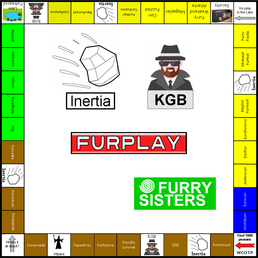 I uploaded a new version of the Furopoly board. It's now called "Furplay" and looks a lot less like Monopoly. Still has rectangles in a track around the outside of the board, and two kinds of cards, but the design of the squares changed. I have only four colors of "properties": brown: mucks/muds green: Furry art sites like this one, inkbunny, and sofurry yellow: furry cons blue: Mainstream SF cons (I included the two biggies: Worldcon and Eurocon)