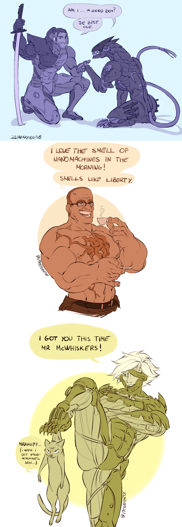 Here are a few sketches I made after playing Metal Gear Rising. I honestly loved that game so much, and it had so many awesome and cheesy things :D It gave me a few stupid little ideas, and I just couldn’t hold back, I had to draw them :D So here are three small fanart sketches :)