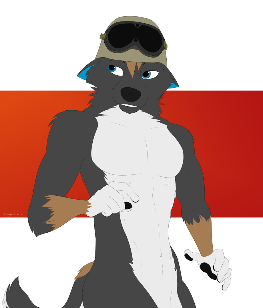 Wearing a kevlar helmet and googles, typical army wear (which I have a soft spot for)