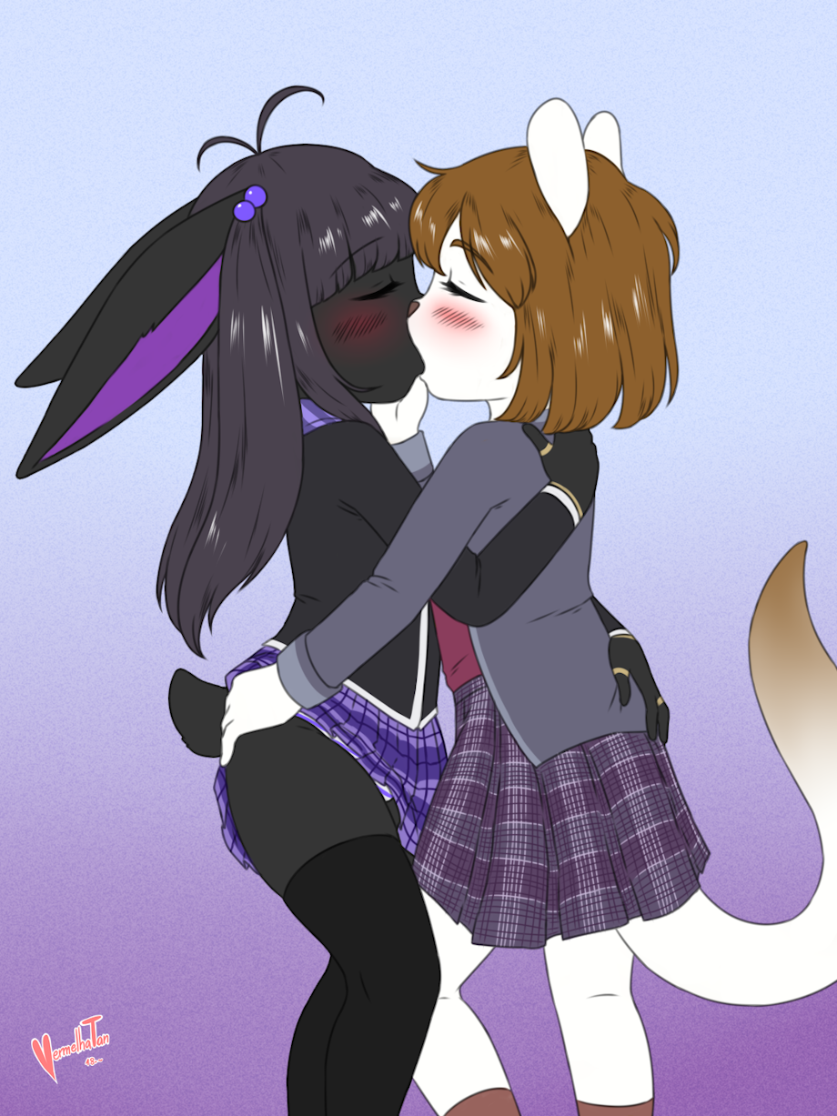 This is so sweet. The kiss is beautifully done, and I love the tender, affectionate feeling you've captured between these two youngsters. The cheeky little grope the kitty is giving her bunny friend is a cute little detail, and I like how it's sensual and alluring, without spoiling the romantic mood of the image. They're both gorgeous girls and you've done an amazing job with them!
