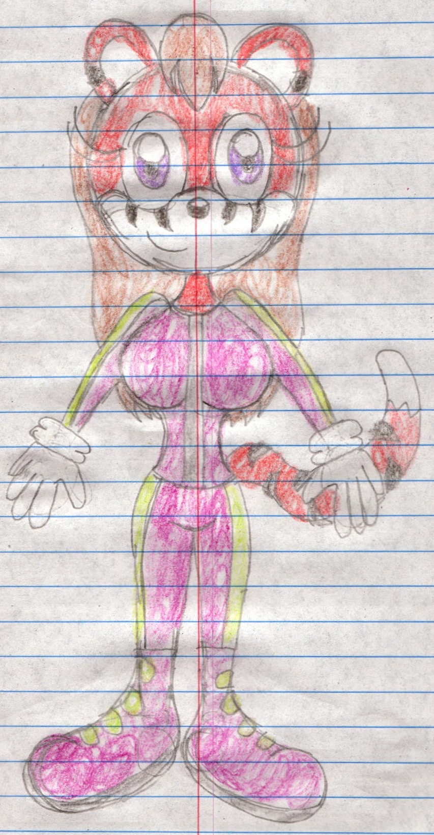 In celebration of the upcoming release of Team Sonic Racing, I drew Liea the Tigress wearing a racing uniform consisting of a two-tone magenta and lime green jacket, pants, and boots.