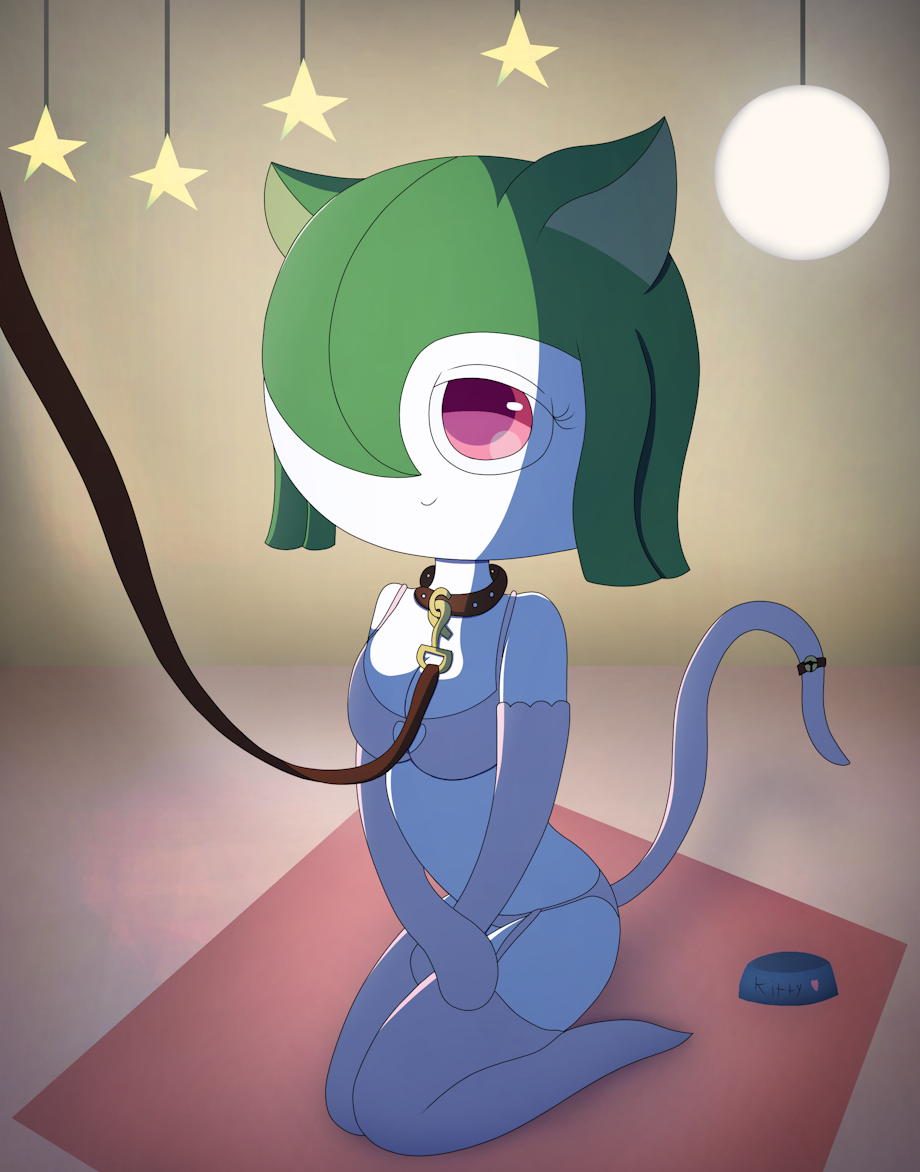 A kirlia dresses up as a kitty. Instead of going outside, she acts out on some foreplay with the only other one with her, as she decides to play the role of his pet.