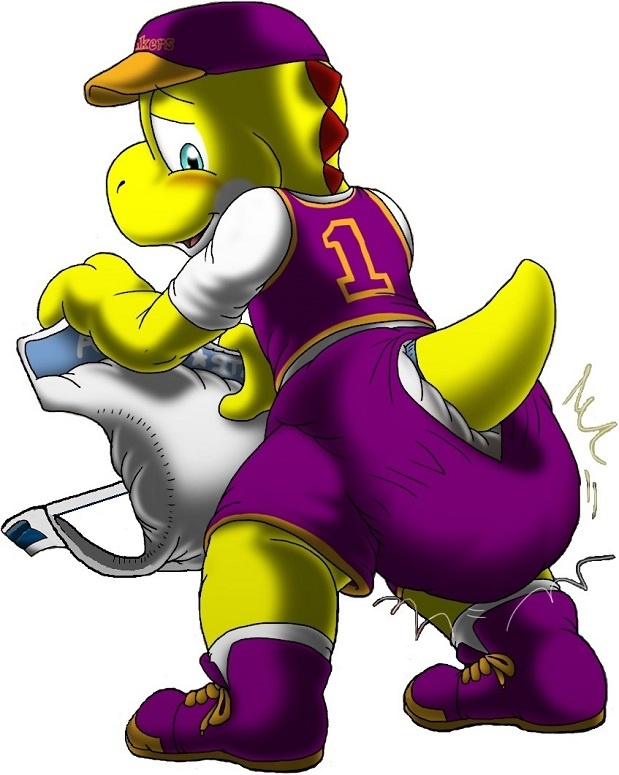 After Starbuck finished relieving himself (and destroying his shorts), he went along with Coach Sullivan to get changed in the locker room. As coach finished cleaning the big hatchy and was about to tape the diaper snugly, the dino began to let go in his diaper as well, bulging his shorts out. This caught the dragon in surprise, unaware that Coach used his diapers just like the rest of the team.