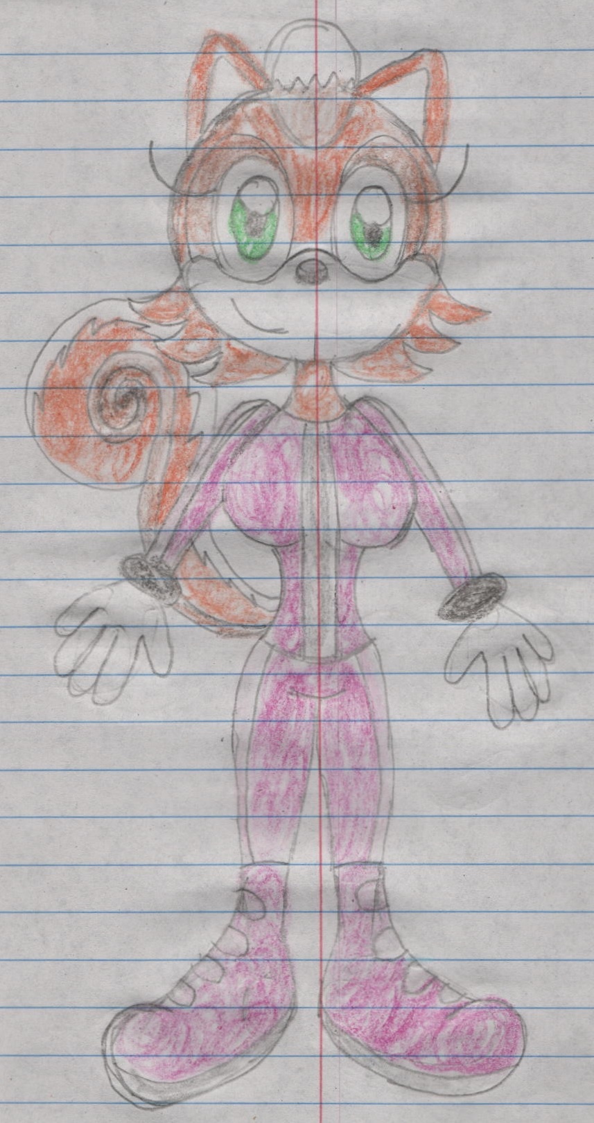 Here, we have Chelsea the Squirrel wearing a racing uniform of a two tone magenta and pink jacket, pants, and boots.