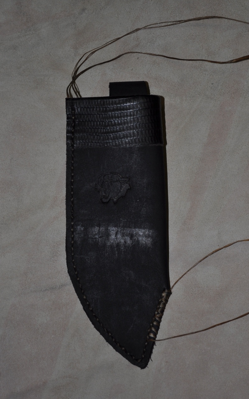 This is a sheath that I made over thanksgiving for a cousin here it is mostly done. the edge is double stitched and the double whip stitch has been started.