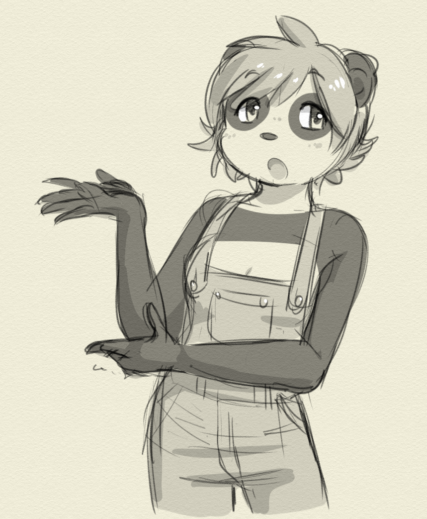 Overalls and no top is like my favorite clothing kink for pictures, and Tia likes it too... something like a kigurumi with nothing under is even better in a story, but hard to show in a picture.