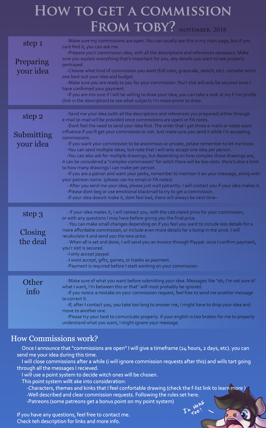 If you are interested in getting a commission, I Higly recomend that you read this info, so you know exactly how to proceed, and increase your odds of getting your commission picked. Every commission idea I get, will go trhough a point system I have, and in the end, the ones with more points will get picked.