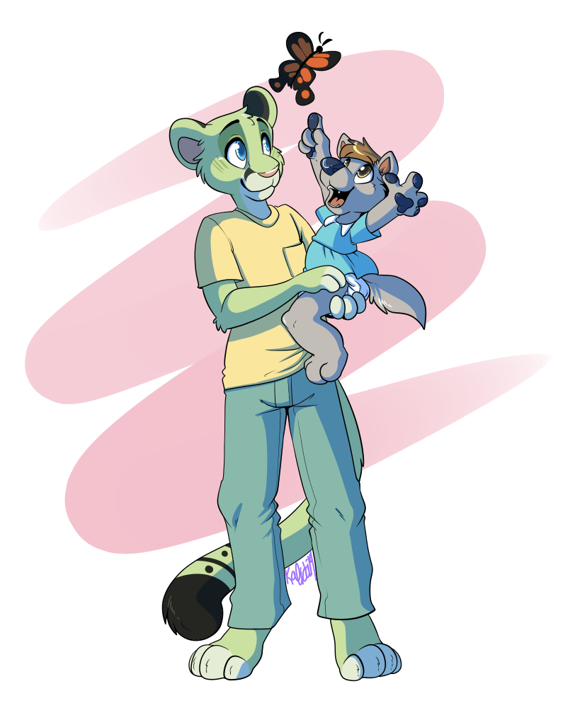 Such a large and bright thing caught the wolf pup's eye and he turned with a squeal of delight to chase after it, half-jumping with his arms upraised as the thing swooped and soared just out of the little one's reach. Xander caught up with the small cub and scooped him up in his arms just as the butterfly hovered above their heads. Reaching high Speckie just almost has it! Almost there! Just one touch!