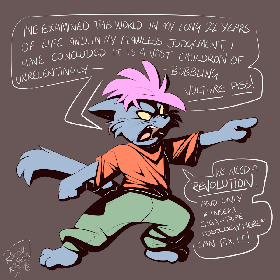 | " | It isn't a strictly political thing, it's more about concluding that the world is a huge sack of shit, that it needs to be fixed and that a particular ideology is the way to go about it. Maybe it's a religion, or a political ideology. But it stems from a place of bitterness, misanthropy and malcontent with the world, with existing itself. |
