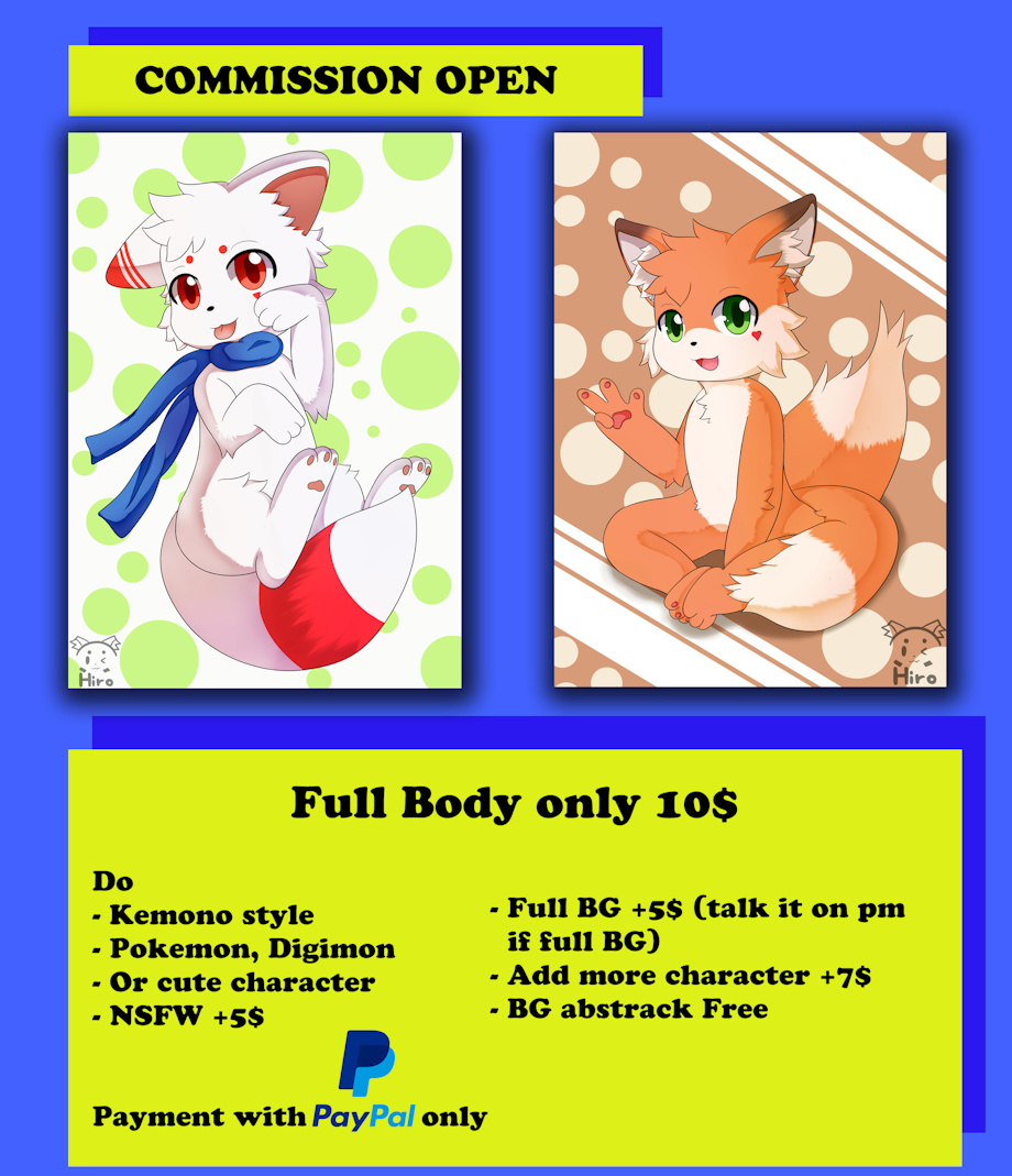 Hello, I open Commission again, I currently need some money to pay some bill like internet quota and other, Full body same as last month is just 10$ if you want to make it NSFW +5$, payment Pay Pal only, thank you ^w^