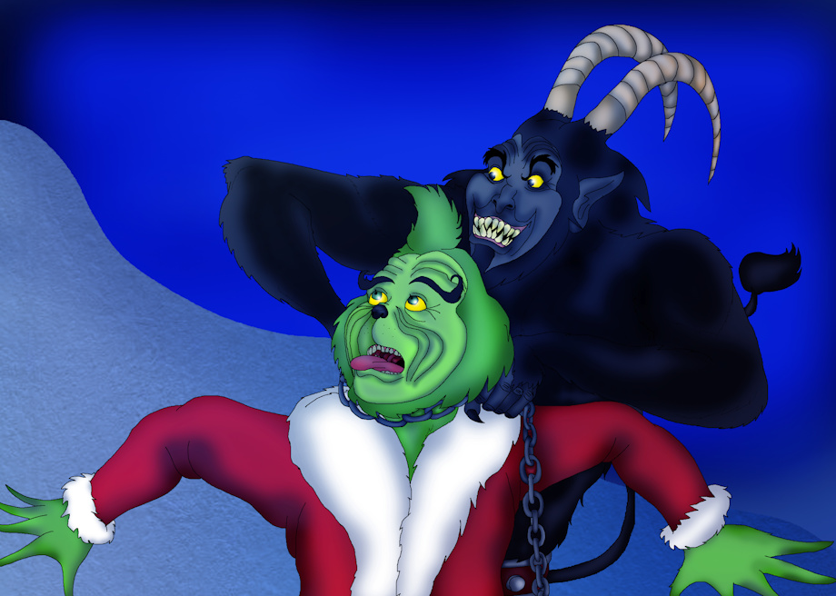 Ruining your childhood again, is the horrible live-action version of the Grinch, choking on some Krampus chains.
