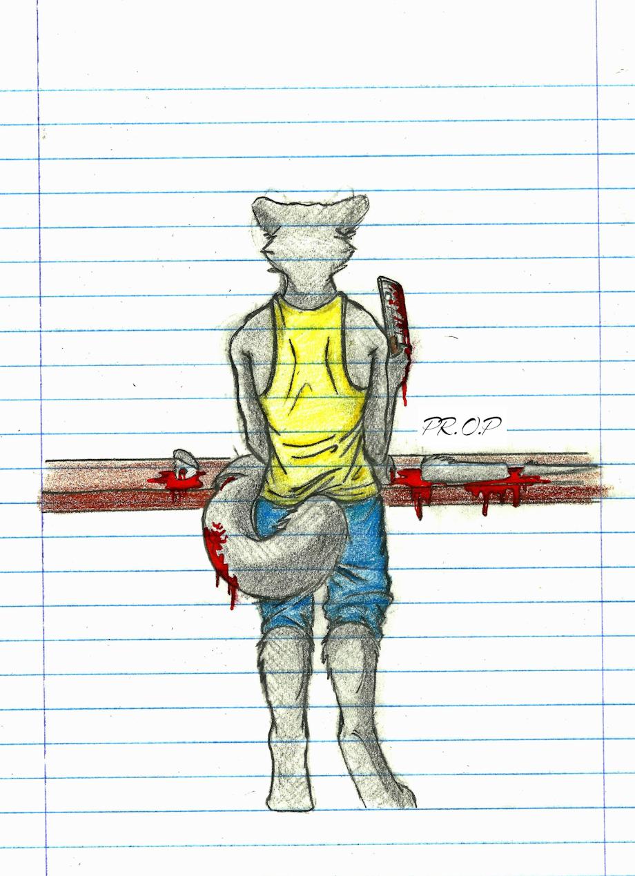 Here, we have a random anthropomorphic character, who is depicted chopping his own tail, under hypnosis. The main idea was to try out new topics on drawing, therefore, practise my skills.