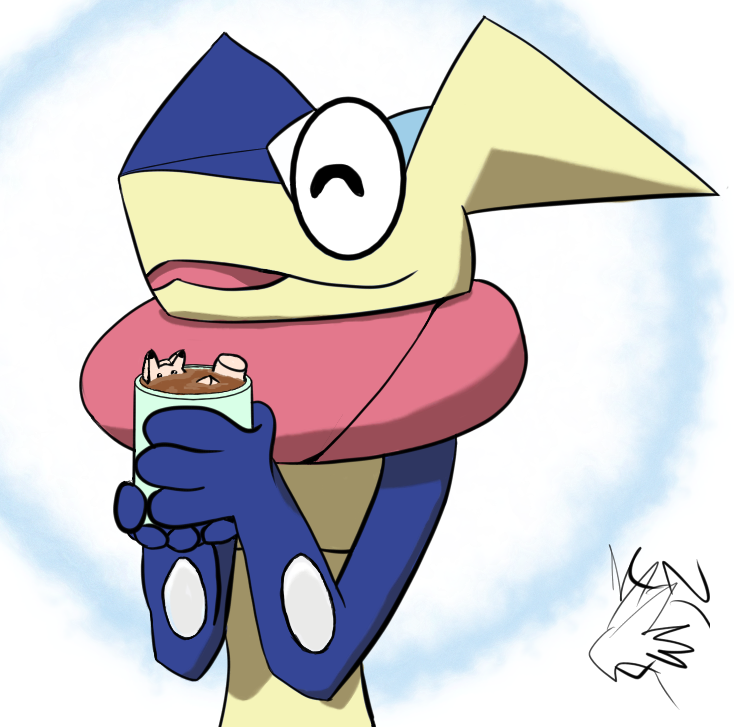 Greninja wishing you a happy Smash Ultimate launch, as well as reminding you to warm yourself with a lovely comfy drink.